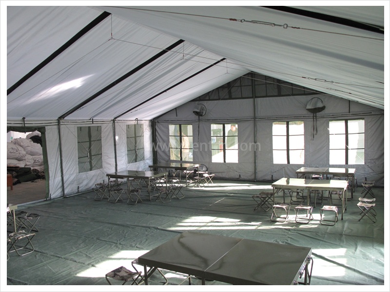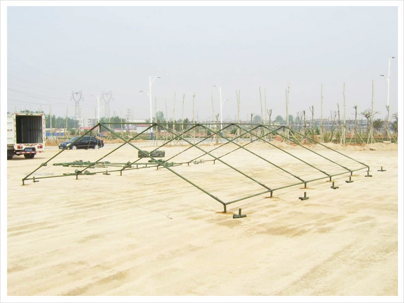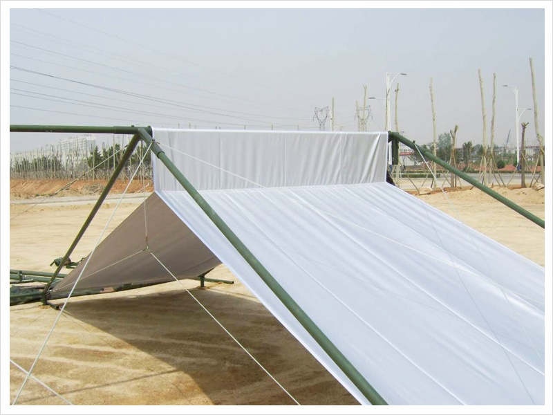 帳篷為雙坡面直墻式框架結(jié)構(gòu),篷架全部采用插接式構(gòu)造,柱底四周設(shè)有落地桿??赏瑫r(shí)滿(mǎn)足75人就餐和75人五日份主副食儲(chǔ)放的基本功能要求。帳篷結(jié)構(gòu)簡(jiǎn)單、零部件通用性好,展開(kāi)方便。篷內(nèi)設(shè)有高反射材料隔熱吊頂,山尖設(shè)有三角通風(fēng)窗,門(mén)窗開(kāi)啟面積較大并設(shè)有紗網(wǎng),夏季篷內(nèi)無(wú)明顯的烘烤感和過(guò)熱現(xiàn)象。包裝件形態(tài)規(guī)則,便于裝載運(yùn)輸。